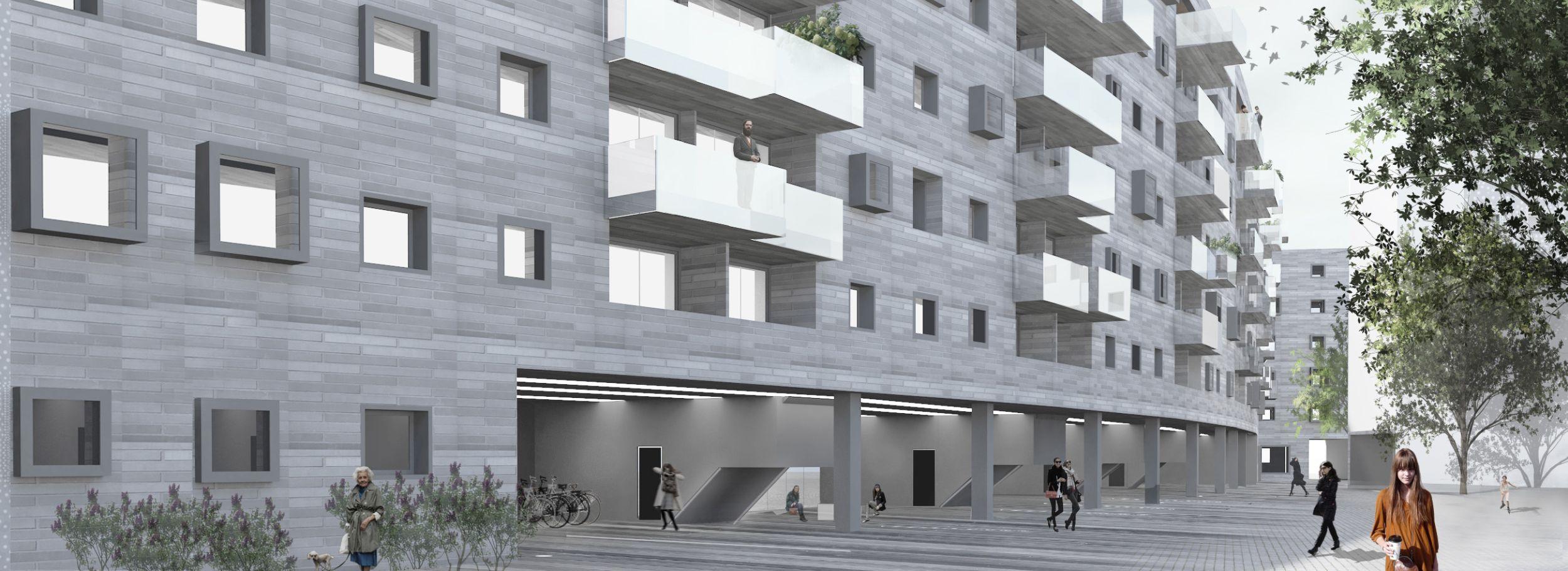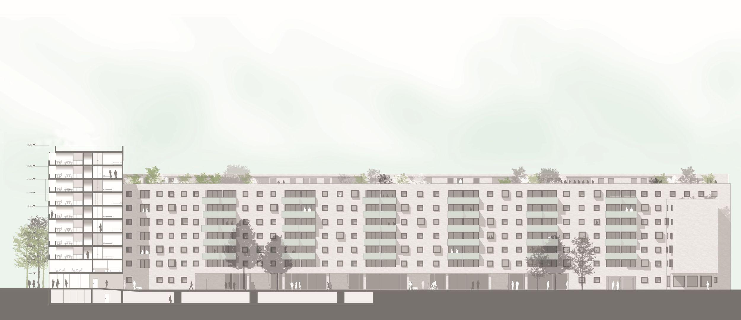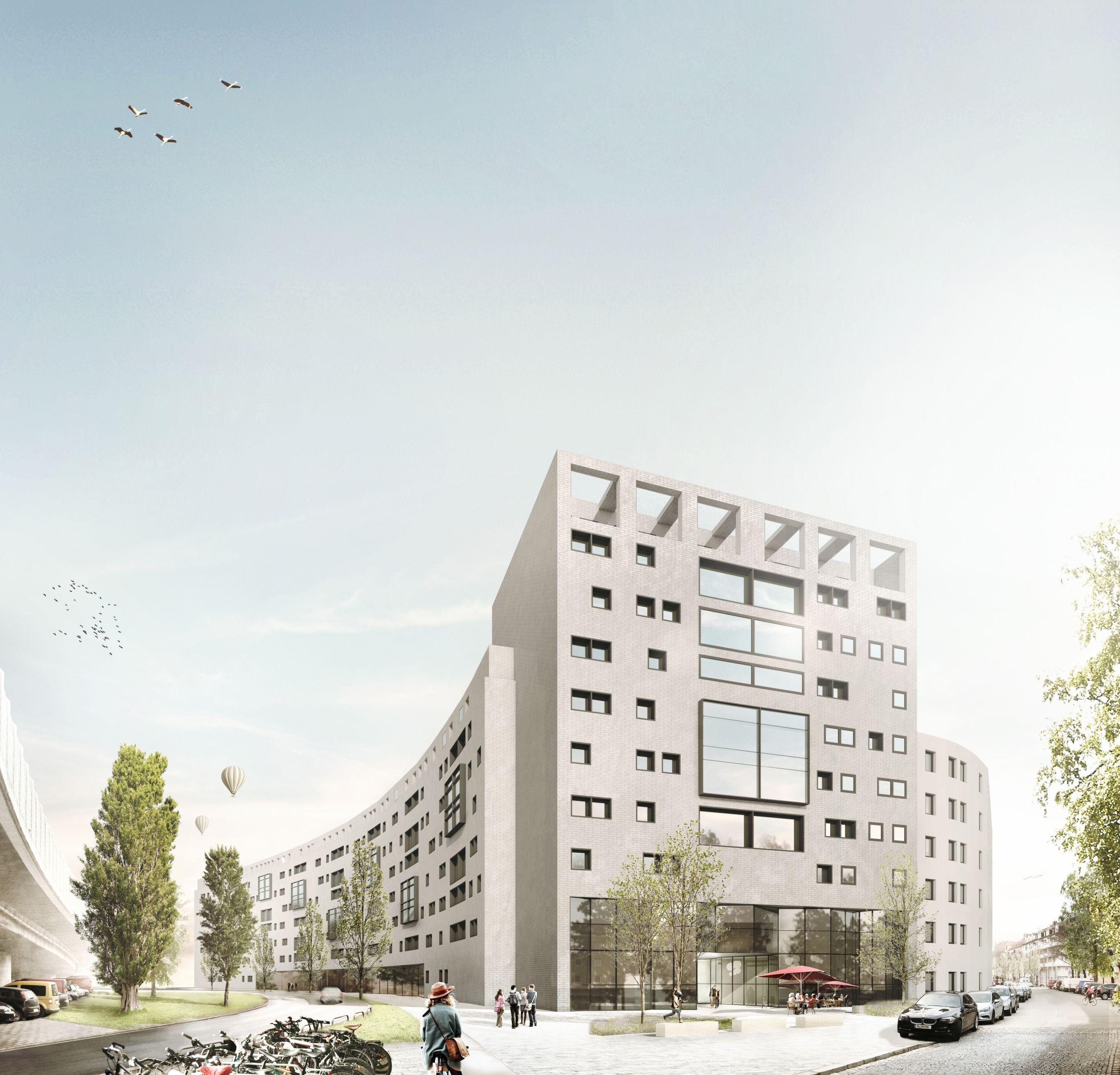Der Entwurf sucht eine Antwort auf den Charakter und die Qualitäten vor Ort. Er will „Wohnen in der Stadt“ mit einer gewissen Normalität abbilden, auch wenn den Gegebenheiten der Aufgabe bezüglich Lärm- und Immissionen besonders Rechnung zu tragen sind. Trotz alle dem will der Entwurf keine Lärmschutzwand ohne Öffnungen sein, sondern Teil eines städtischen Wohnblocks, identitätsstiftend und adressbildend für seine Bewohner und das Baufeld. großzügigen Durchgang, der den öffentlichen Raum mit dem privaten Innenbereich verbindet.