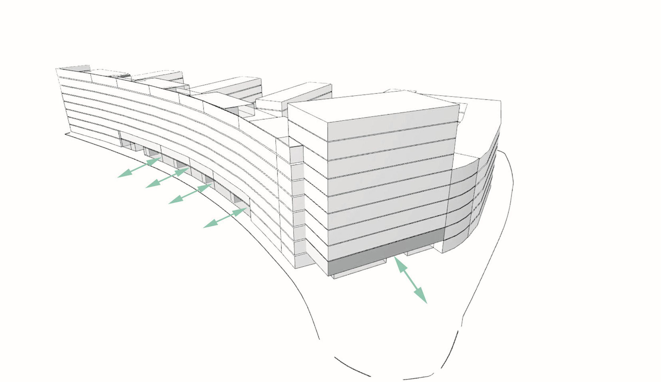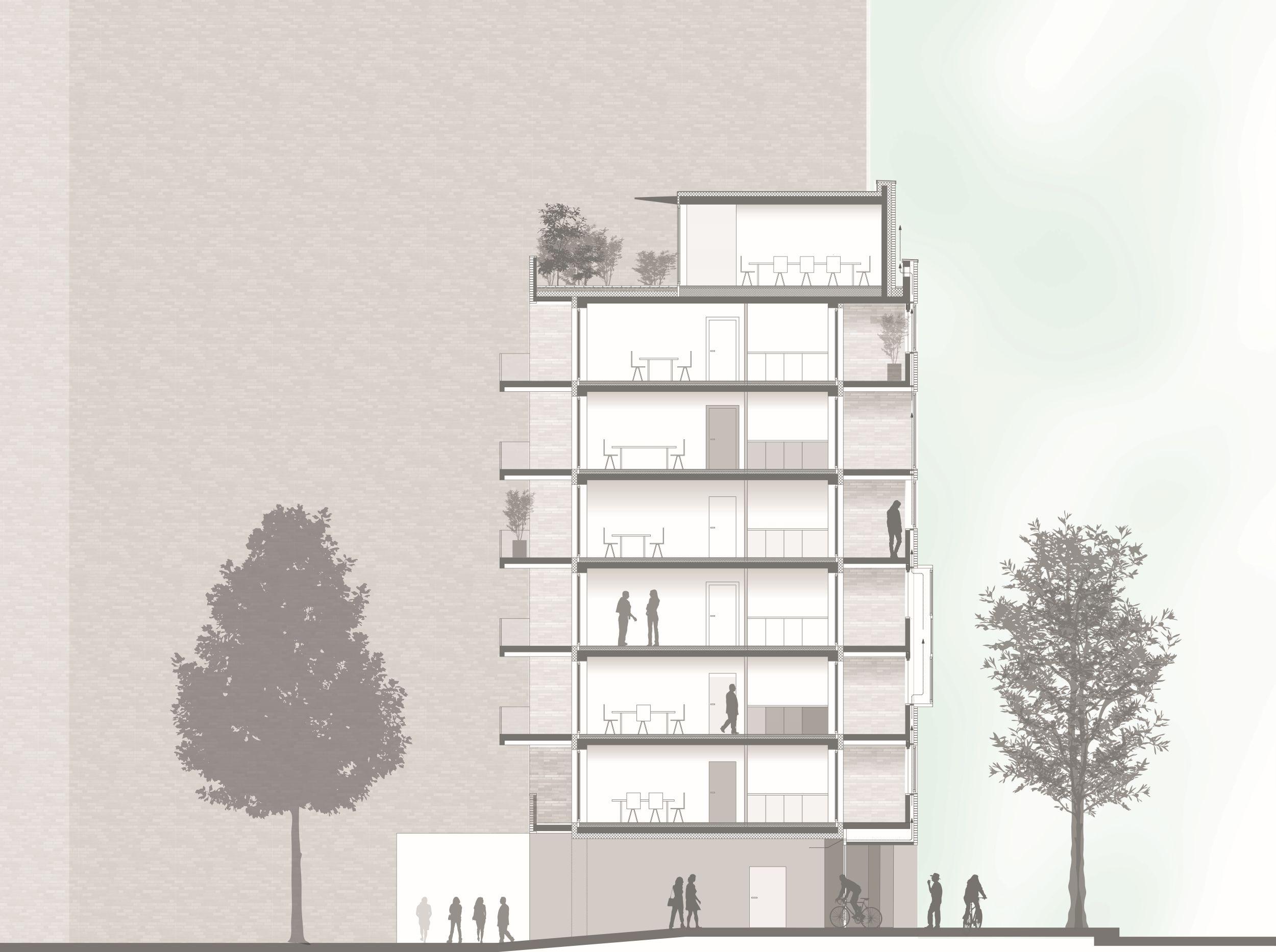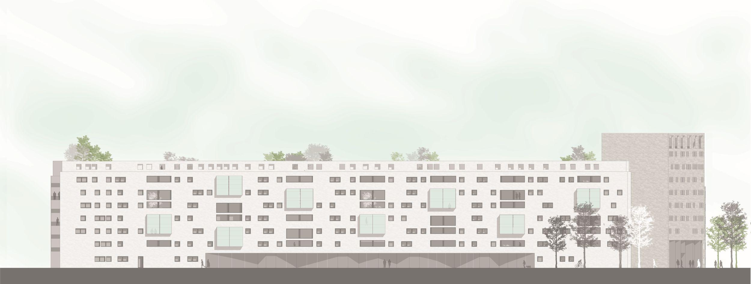Der Entwurf sucht eine Antwort auf den Charakter und die Qualitäten vor Ort. Er will „Wohnen in der Stadt“ mit einer gewissen Normalität abbilden, auch wenn den Gegebenheiten der Aufgabe bezüglich Lärm- und Immissionen besonders Rechnung zu tragen sind. Trotz alle dem will der Entwurf keine Lärmschutzwand ohne Öffnungen sein, sondern Teil eines städtischen Wohnblocks, identitätsstiftend und adressbildend für seine Bewohner und das Baufeld. großzügigen Durchgang, der den öffentlichen Raum mit dem privaten Innenbereich verbindet.