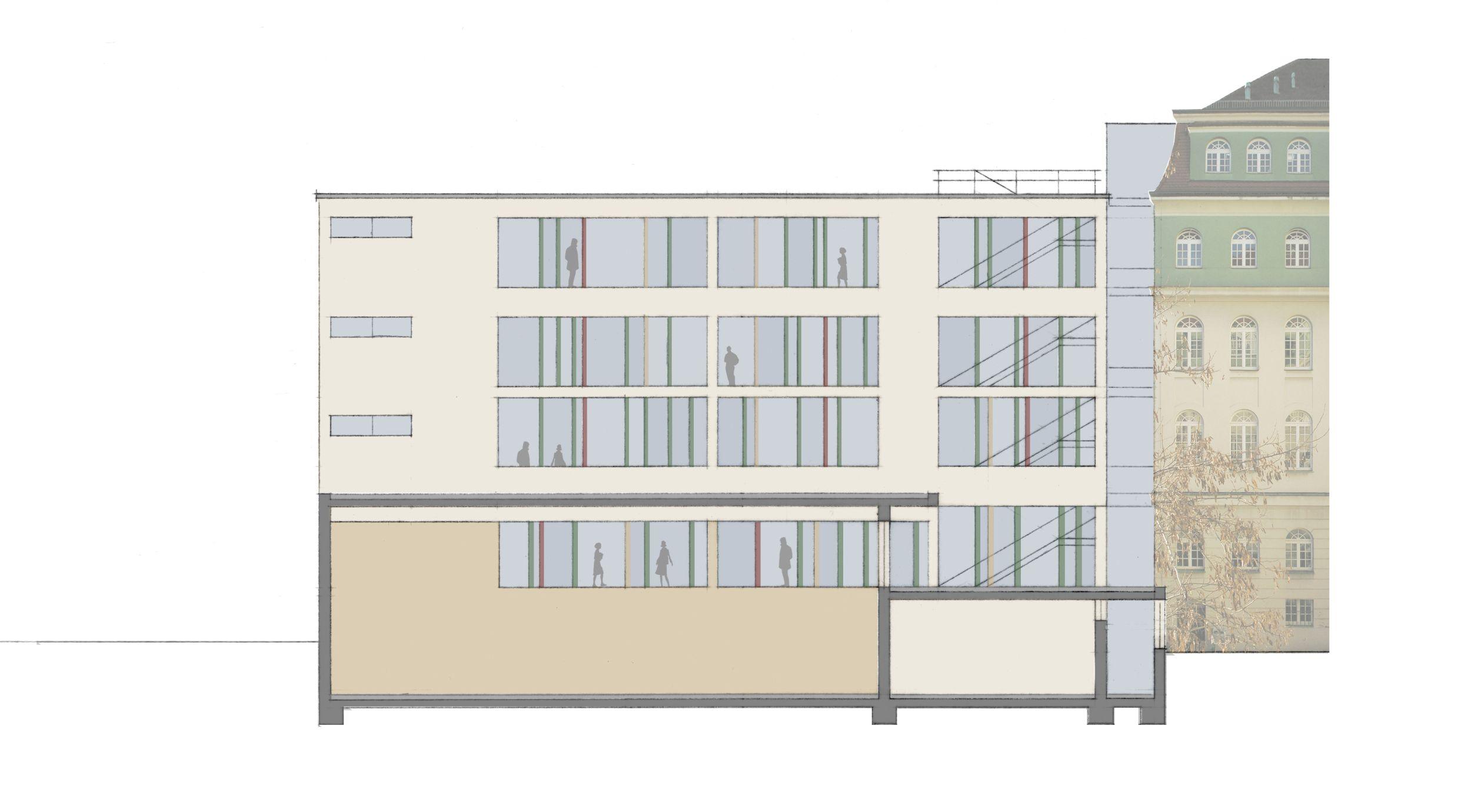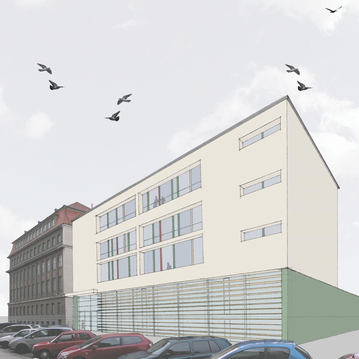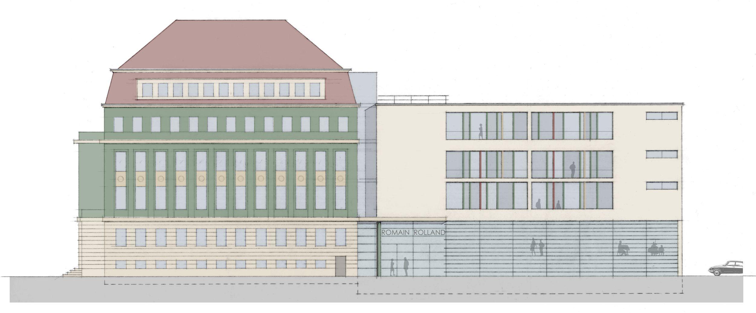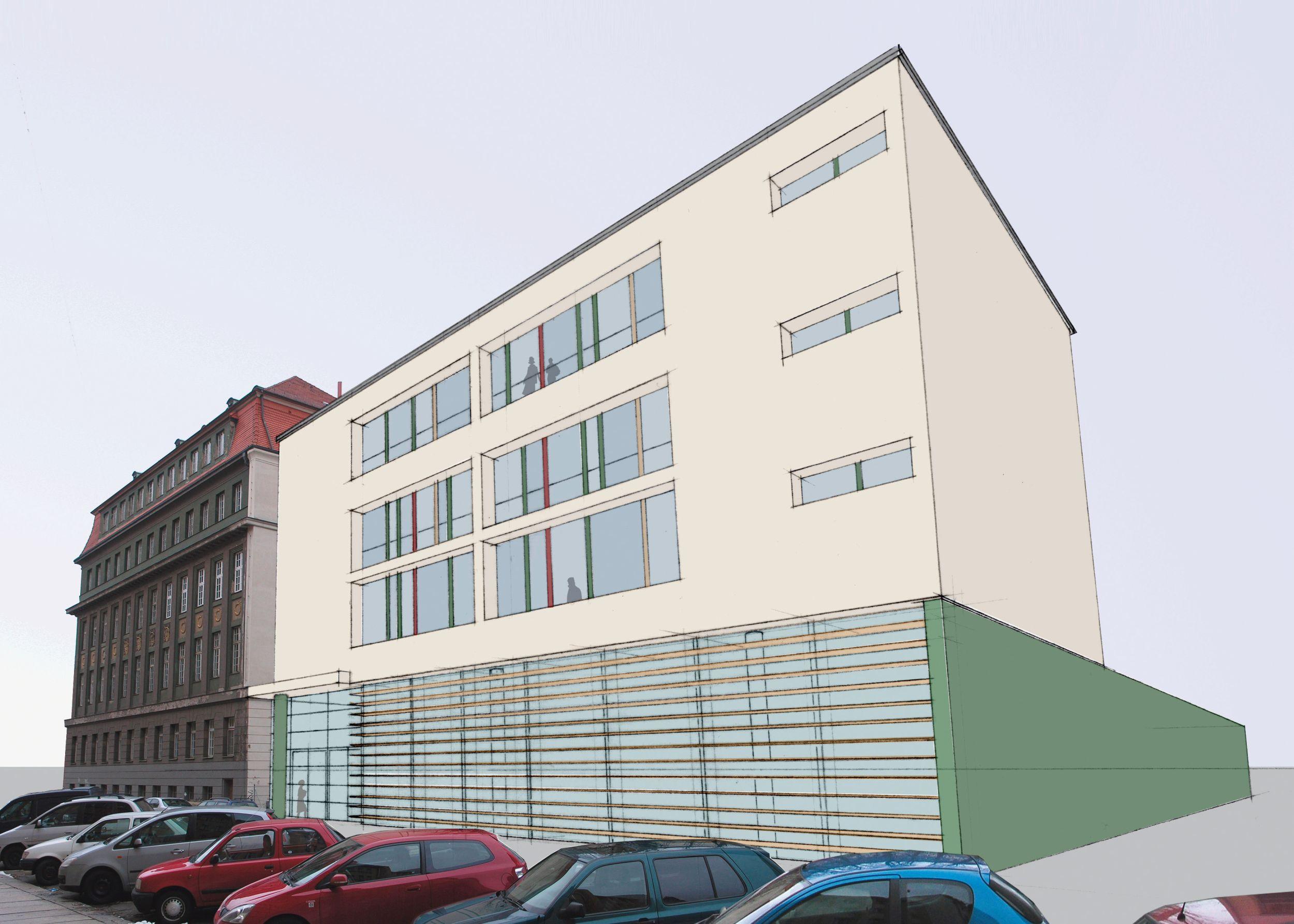 Die ehemalige Studienanstalt für Mädchen, heute Romain-Rolland-Gymnasium (RoRo), und die ehem. Kommunale Berufsschule für Knaben in der Dresdner Neustadt sind zwei von elf Schulbauprojekten von Hans Erlwein, dem damaligen Stadtbaurat und Leiter des Dresdner Hochbauamtes. Die Anlage entstand zwischen 1913 und 1916 als zusammenhängender Gebäudekomplex und ist in die in der Neustadt vorherrschenden Blockrandbebauung eingefügt. Für die geplante Erweiterung, einem Neubau für Fachkabinette, entstand in Kooperation mit der AIC Ingenieurgesellschaft für Bauplanung Chemnitz unser Beitrag „Wissenskommode“ zum Wettbewerb „Umbau des RORO“, der in die engere Auswahlrunde kam.