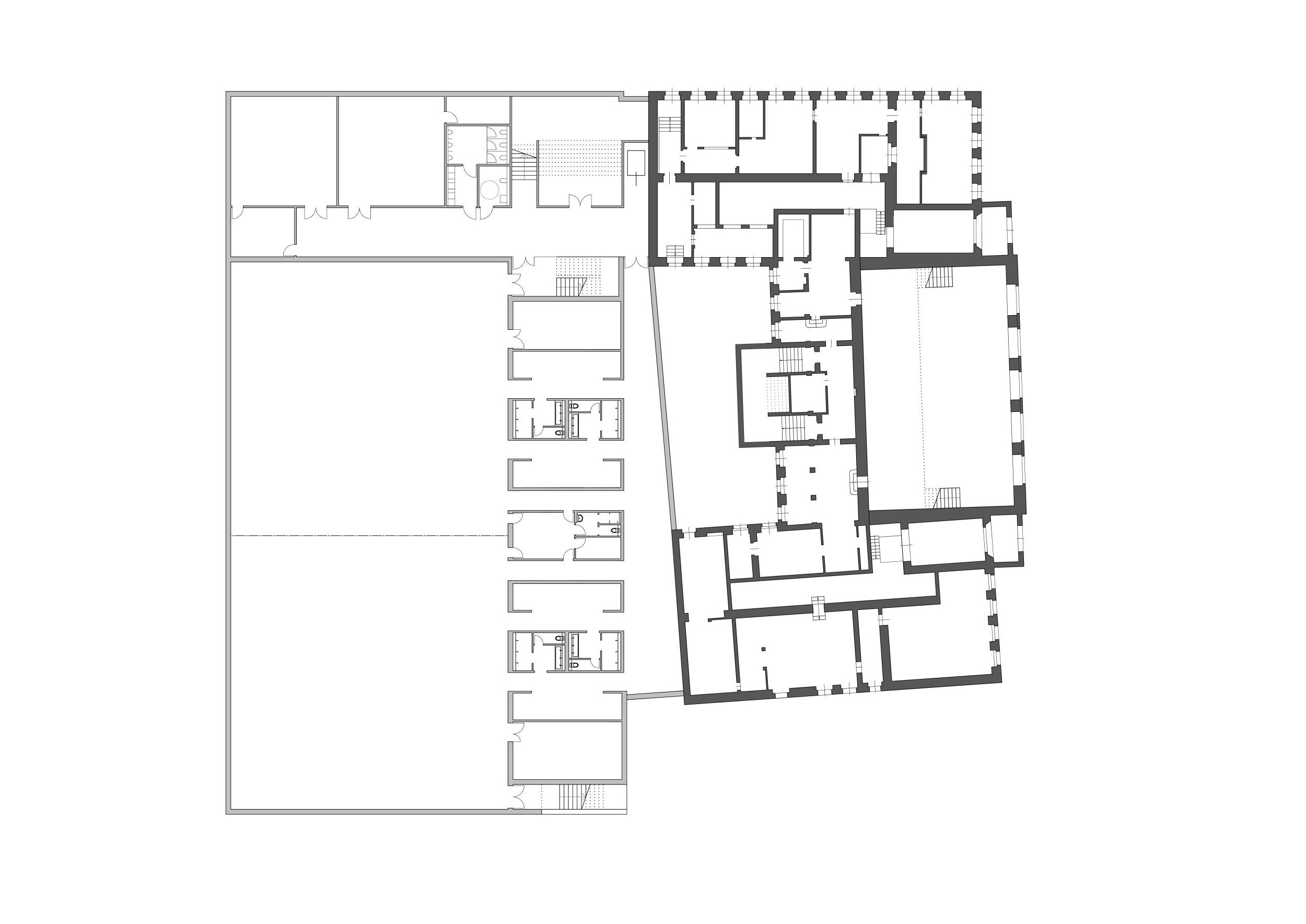 In der Befensterung des Neubaus wird zudem die vertikale Lisenengliederung des Erlweinbaus aufgegriffen. Die Fenster sind so angeordnet, dass sie den vertikalen Rhythmus des historischen Vorbilds widerspiegeln, was zu einer harmonischen Verbindung zwischen Alt und Neu führt. Diese Anordnung unterstützt nicht nur die ästhetische Wirkung, sondern fördert auch die natürliche Belichtung der Innenräume.